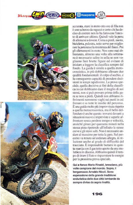 È una guida molto più improvvisata rispetto a quella motocrossi tica, ma il bello dell'enduro è anche questo: trovarsi davanti a situazioni nuove e impreviste e saperle affrontare senza perdere tempo e velocità, anziché girare per quaranta minuti nella stessa pista ripetendo all'infinito le stesse curve e gli stessi salti. Non è necessario andare al massimo per tutta la gara. Sul percorso va tenuta un'andatura allegra, in relazione anche al grado di difficoltà del tracciato. È impensabile buttarsi in quinta marcia con il gas tutto aperto da una mulattiera in discesa. Abbiamo quindi il tempo di tirare il fiato e risparmiare le energie per la prossima prova speciale.